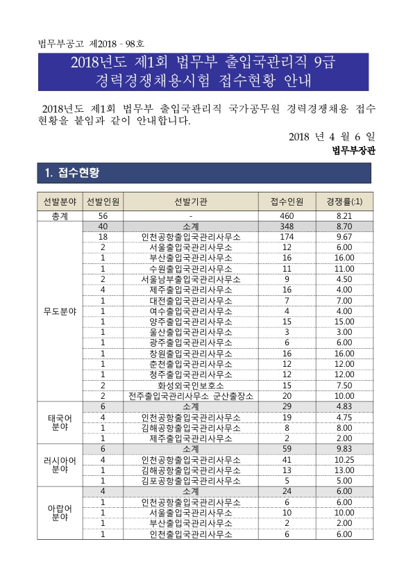☆ 2018 제1회 법무부 출입국관리직 9급 경력경쟁채용시험 경쟁률 페이지 정보 작성자 관리자 댓글 0건 조회 1,953회 작성일 18-04-08 11:17 목록 본문 이전글☆ 2018 제3회 전북 지방공무원 임용시험 경쟁률(잠정) 18.04.10 다음글★ 2018 광주시교육청 지방공무원 임용시험 경쟁률 18.04.05 댓글 0 댓글목록 등록된 댓글이 없습니다.