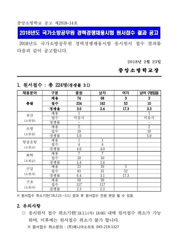 ☆ 2018 중앙소방학교 국가소방공무원 경력경쟁채용시험 경쟁률(잠정)