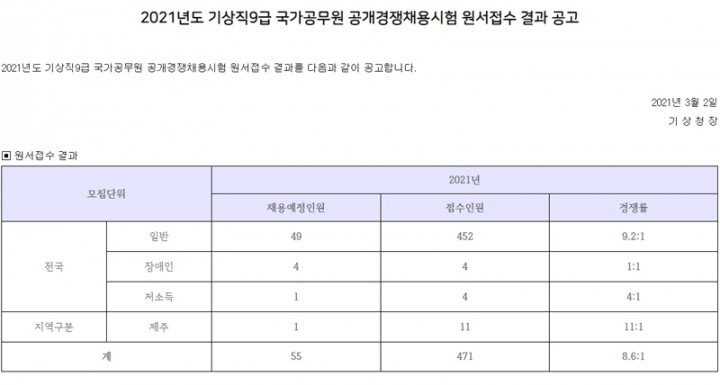 ☆ 2021 기상청 기상직 9급 국가공무원 공개경쟁채용시험 경쟁률 페이지 정보 작성자 관리자 댓글 0건 조회 2,034회 작성일 21-03-05 11:57 목록 본문 [이 게시물은 관리자님에 의해 2021-03-05 11:57:10 최근시험공고문에서 복사 됨] 이전글☆ 2021 광주시 청원경찰 임용시험 경쟁률 21.03.09 다음글★ 2021 제19회 국회사무처 8급 공개경쟁채용시험 경쟁률 21.03.05 댓글 0 댓글목록 등록된 댓글이 없습니다.