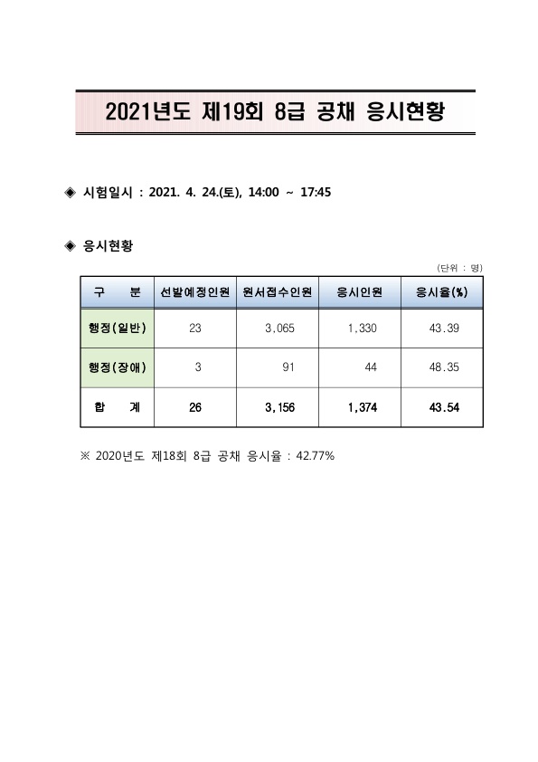 ★ 2021 제19회 국회사무처 8급 공개경쟁채용시험 필기시험 응시율 페이지 정보 작성자 관리자 댓글 0건 조회 1,715회 작성일 21-05-21 15:03 목록 본문 [이 게시물은 관리자님에 의해 2021-05-21 15:03:08 최근시험공고문에서 복사 됨] 이전글★ 2021 해군/해병대 일반군무원(공채.경채) 채용시험 경쟁률 21.05.21 다음글☆ 2021 기상청 기상직 9급 국가공무원 공개경쟁채용시험 필기시험 합격선 21.05.05 댓글 0 댓글목록 등록된 댓글이 없습니다.