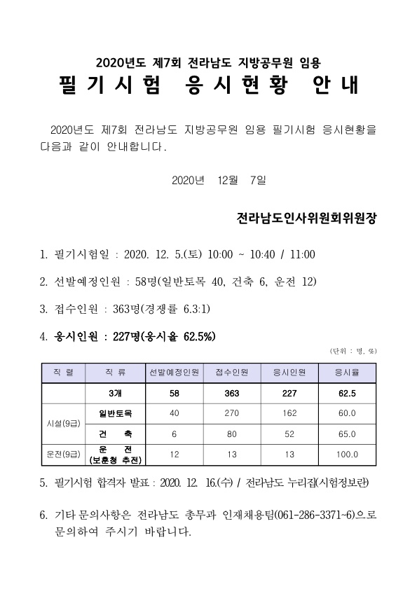 ☆ 2020 제7회 전남 지방공무원 임용 필기시험 응시율 페이지 정보 작성자 관리자 댓글 0건 조회 1,734회 작성일 20-12-07 16:25 목록 본문 [이 게시물은 관리자님에 의해 2020-12-07 16:26:00 최근시험공고문에서 복사 됨] 이전글★ 2020 제2차 경찰청 경찰공무원 채용 필기시험 합격선 20.12.21 다음글☆ 2020 제3회 전남교육청 지방공무원 임용 필기시험 합격선 20.12.03 댓글 0 댓글목록 등록된 댓글이 없습니다.