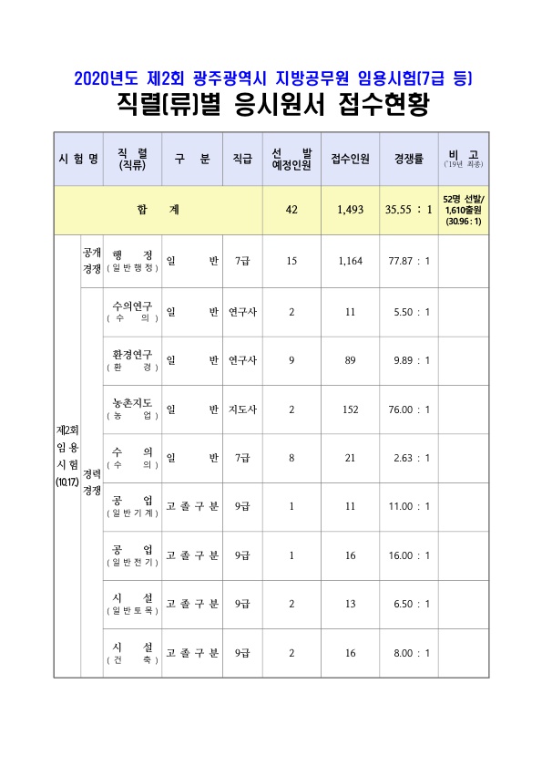 ★ 2020 제2회 광주시 지방공무원 임용시험 경쟁률 페이지 정보 작성자 관리자 댓글 0건 조회 1,610회 작성일 20-08-20 08:30 목록 본문 [이 게시물은 관리자님에 의해 2020-08-20 08:30:34 최근시험공고문에서 복사 됨] 이전글★ 2020 인사혁신처 국가공무원 9급 공개경쟁채용 필기시험 합격선 20.08.20 다음글★ 2020 인사혁신처 국가공무원 7급 공채시험 경쟁률 20.08.20 댓글 0 댓글목록 등록된 댓글이 없습니다.