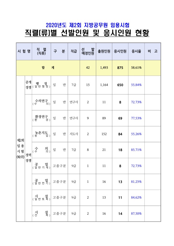 ★ 2020 제2회 광주시 지방공무원 임용 필기시험 직렬별 응시율 페이지 정보 작성자 관리자 댓글 0건 조회 1,579회 작성일 20-10-26 16:04 목록 본문 [이 게시물은 관리자님에 의해 2020-10-26 16:04:40 최근시험공고문에서 복사 됨] 이전글★ 2021 제70기 경찰간부후보생 선발시험 경쟁률 및 합격선 20.11.06 다음글★ 2020 제4회 전남 지방공무원 임용 필기시험 응시율 20.10.26 댓글 0 댓글목록 등록된 댓글이 없습니다.