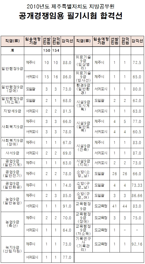 2010 제주도 지방(일반, 소방) 교육청 공무원 임용 필기시험 합격선